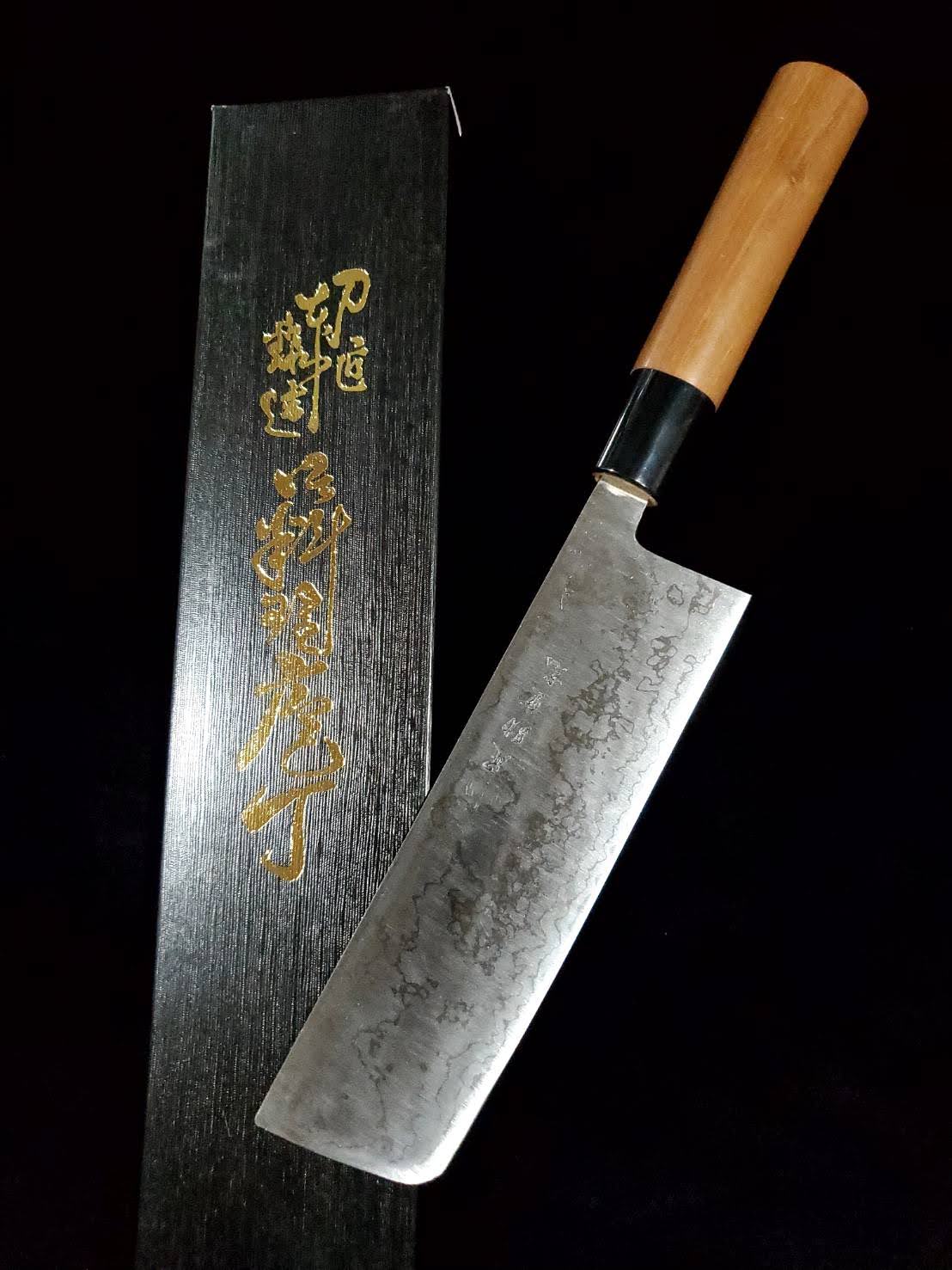 | その他 | 刃の材質:主に安来鋼多層鋼、V特2号多層鋼 刃付け :両刃 刃渡り :約165mm 刃幅 :約50~55mm 柄の材質:クルミ柄 ※手造りのため、大きさ形に多少の誤差がございます。 ※刃が大きく欠ける原因となりますので、魚や肉の骨、冷凍物などの硬い食材へのご使用はお控え下さい。 ※錆がきやすい材質のため、使用後は水かお湯でよく洗い、乾いた布で水分をよくふき取って下さい。 |